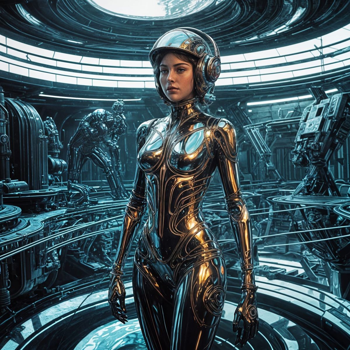 This image shows a stunningly detailed representation of a woman's body, where flesh and robotics seamlessly blend together in a vibrant display of color and texture.
