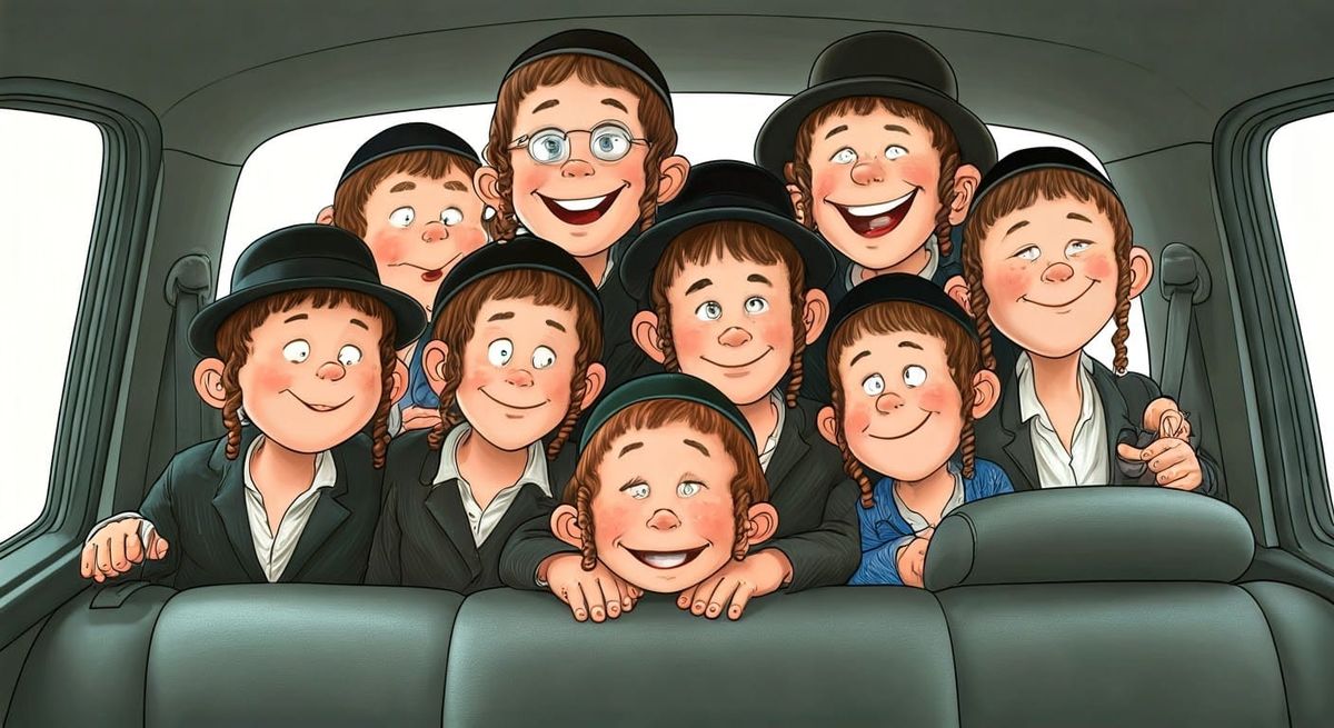 This image shows seven Orthodox Jewish boys crammed into the back seat of a car. The cartoonish style and cheerful expressions give the image a lighthearted feel.