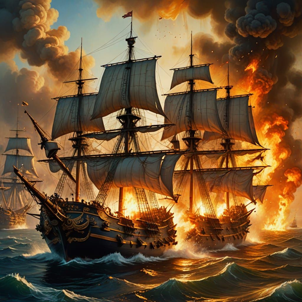 A dynamic Baroque naval battle scene featuring old galeons with cannons firing. Dramatic golden hour lighting illuminates splashing water, smoke, flames, and sparks in a vibrant, warm color scheme.
