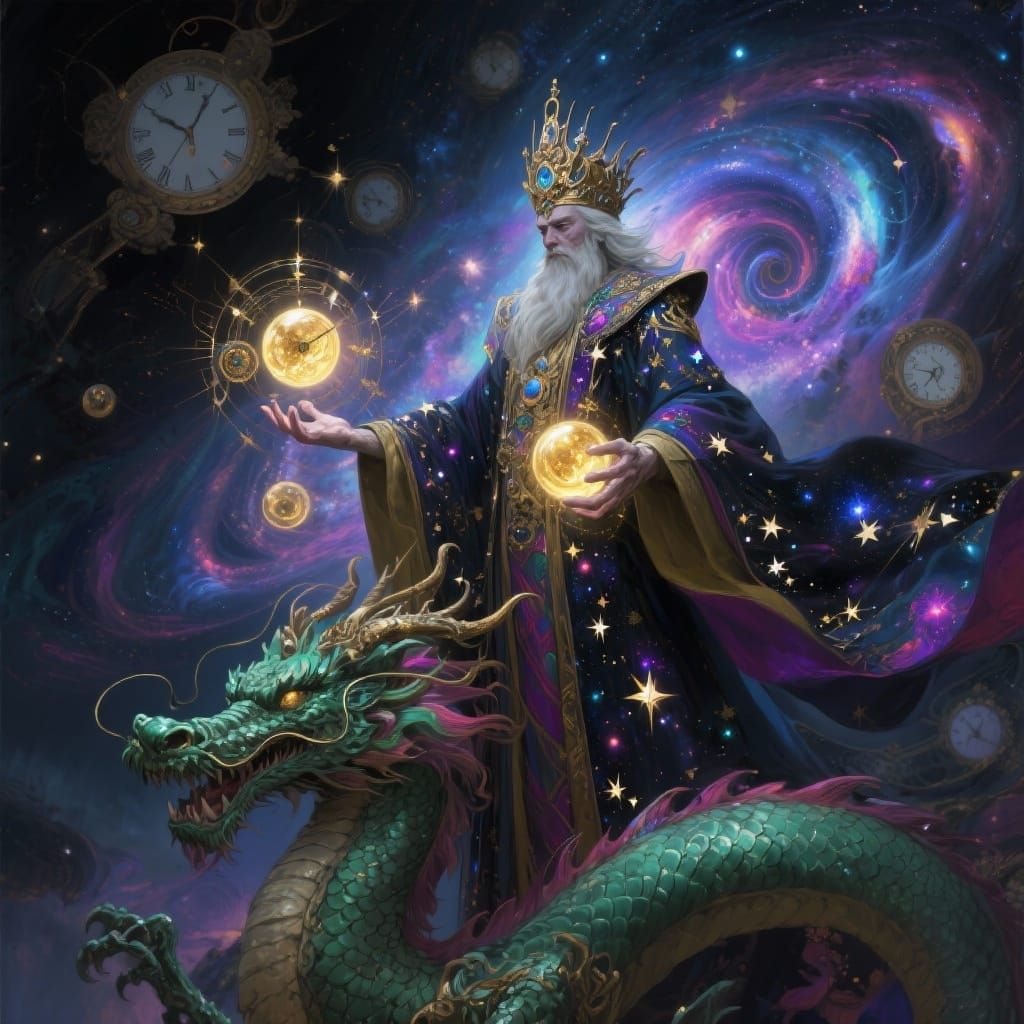 This image depicts a crowned time wizard on a jade dragon, manipulating ethereal light orbs. Cosmic swirls and celestial clocks fill the background in a dramatic digital painting style.