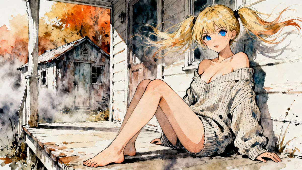 This image features a cute, alluring blonde woman with big blue eyes in a pin-up style, sitting on a porch with a rustic shed. The artwork uses abstract watercolor washes and a warm triadic color palette.