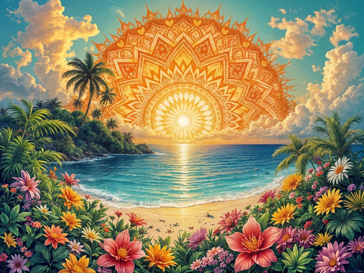 This image shows a vibrant floral mandala above a lush tropical island scene. The artwork features a radiant sun and highlights the serene beauty of nature.