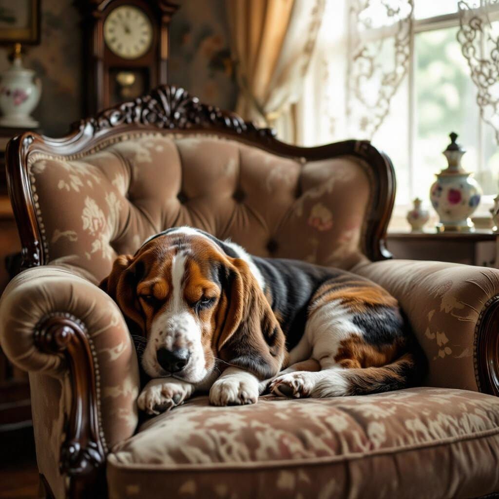 This image shows a Basset Hound resting on an antique velvet armchair in a sunlit Victorian room. The scene evokes a warm, nostalgic mood with soft, vintage-style lighting.