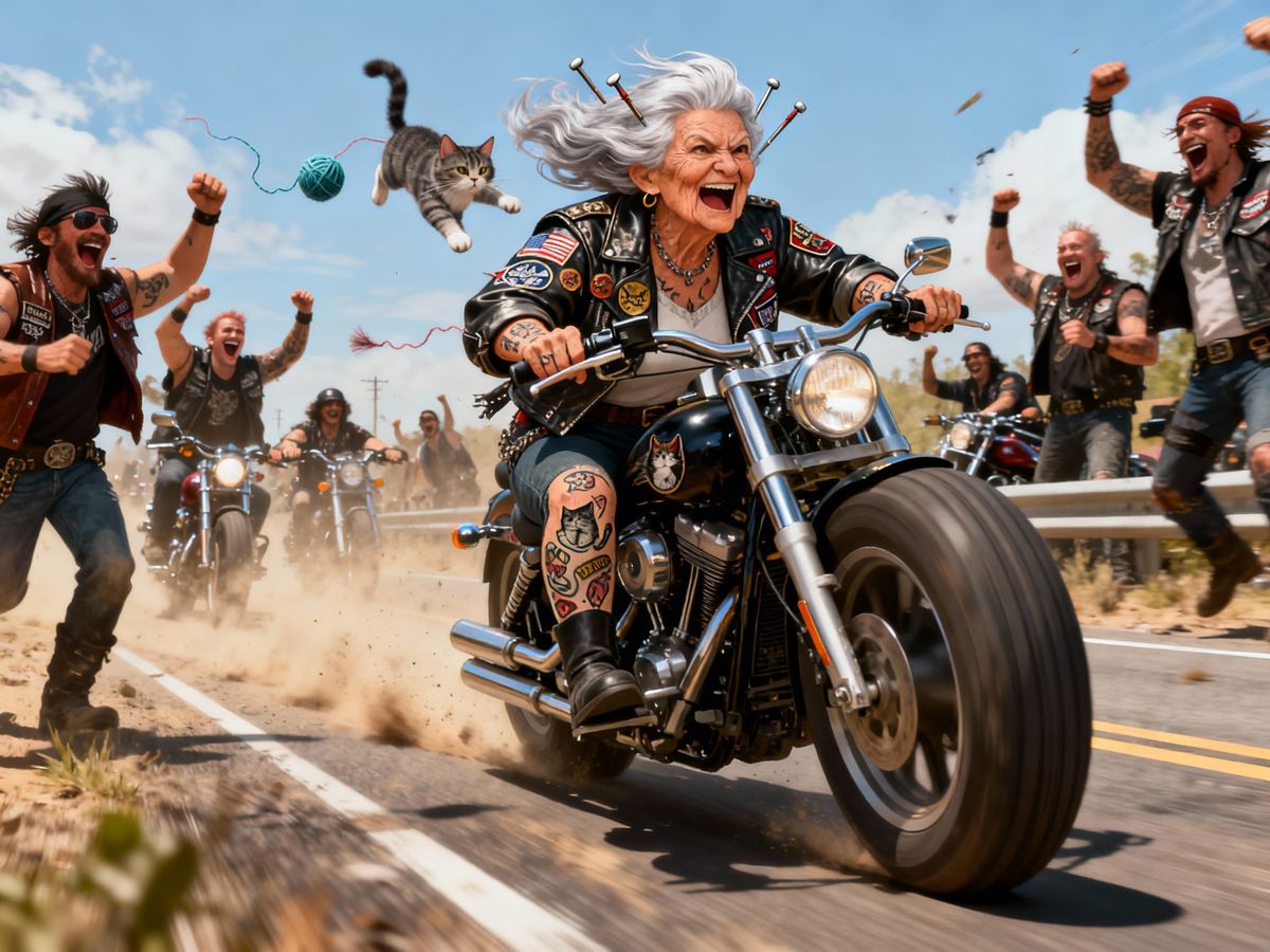 A fierce elderly woman with silver hair rides a giant motorcycle down a dusty highway, wearing a patched leather jacket. Humorous, rebellious scene with bikers in the background, in a cartoon realism style with bold colors.
