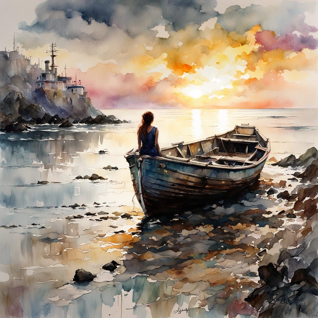 A watercolor painting shows a woman near an old boat on a rocky shore. A fairytale sunset and mist create dramatic light in this hyperdetailed fantasy image with rough textures.