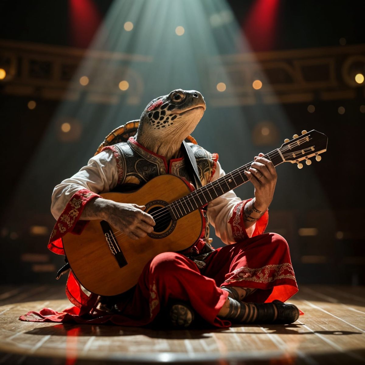 This image shows a turtle playing a flamenco guitar on a brightly lit stage. The low-angle, extreme close-up shot and tilt-shift effect capture the musician's gentle melody.
