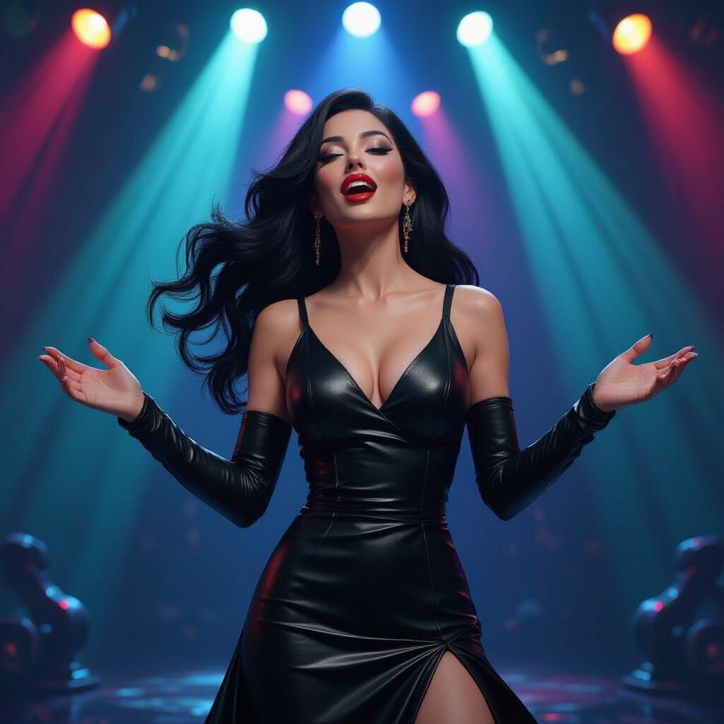 This image shows a singer with dark hair in a leather dress on stage, illuminated by colorful spotlights. Rendered as a detailed matte painting in a high-fantasy concept art style.