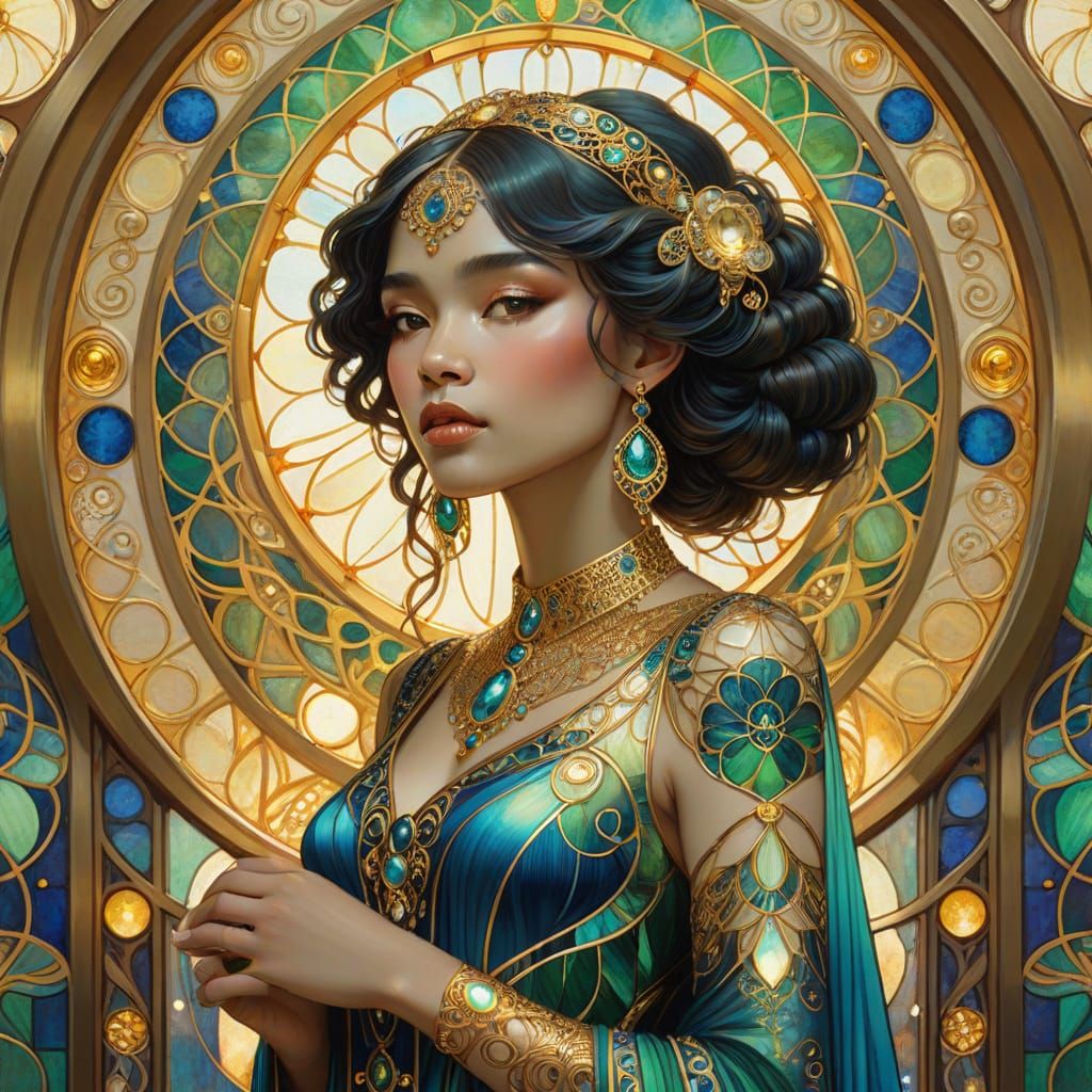 A striking picture of a woman in an ornate hall wearing a flowing gown. The artwork features vivid colors, golden accents and curved lines in an art nouveau aesthetic.