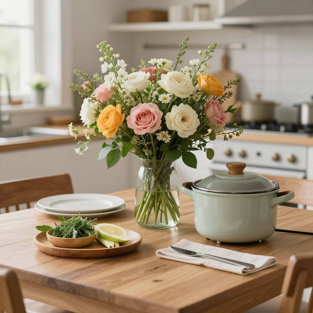 This image depicts a serene, plant-filled kitchen scene. A beautiful bouquet of flowers rests on the table, creating a peaceful and inviting atmosphere.
