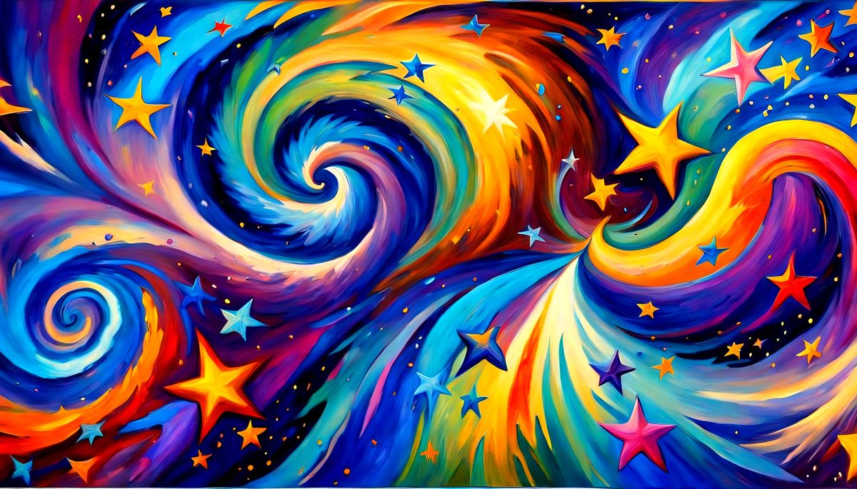 This image depicts a close-up of interacting blue proto-stars forming swirling patterns. It features a high-velocity, shimmering rainbow-enamel cylinder with iridescent exhaust, rendered in a textured, neo-impressionist expressionist style oil painting.