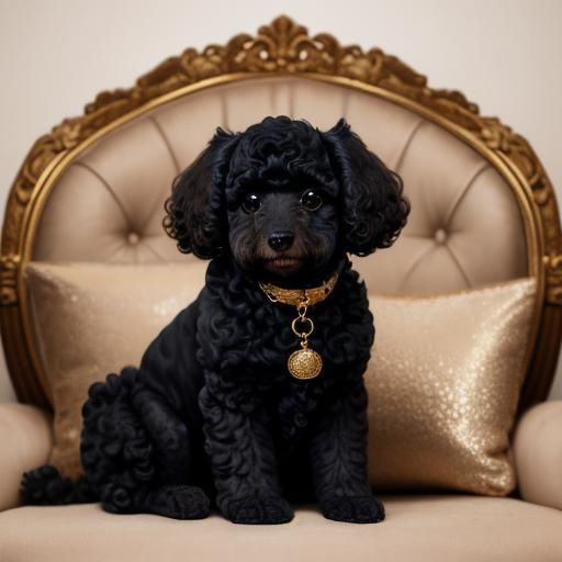 This image shows a charming pet portrait of a fluffy black poodle mix. The dog sits on a velvet cushion in a cozy room, captured in soft focus with warm, golden lighting. The artwork is highly detailed.