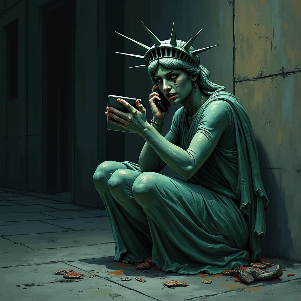 This image shows the Statue of Liberty in a state of distress, battered and bruised, speaking on a phone in a dimly lit alleyway. Blending dark, gritty illustrations with atmospheric lighting and detailed textures, this piece captures a moment of worry and fear.