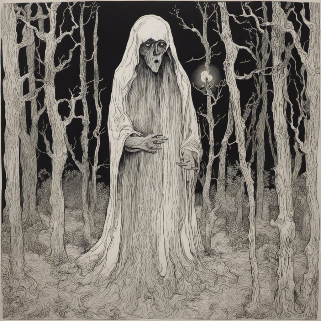 This image depicts a spectral figure within a dark, haunted forest. The artwork combines elements of horror and intricate zentangle patterns, rendered in a style reminiscent of early European masters.