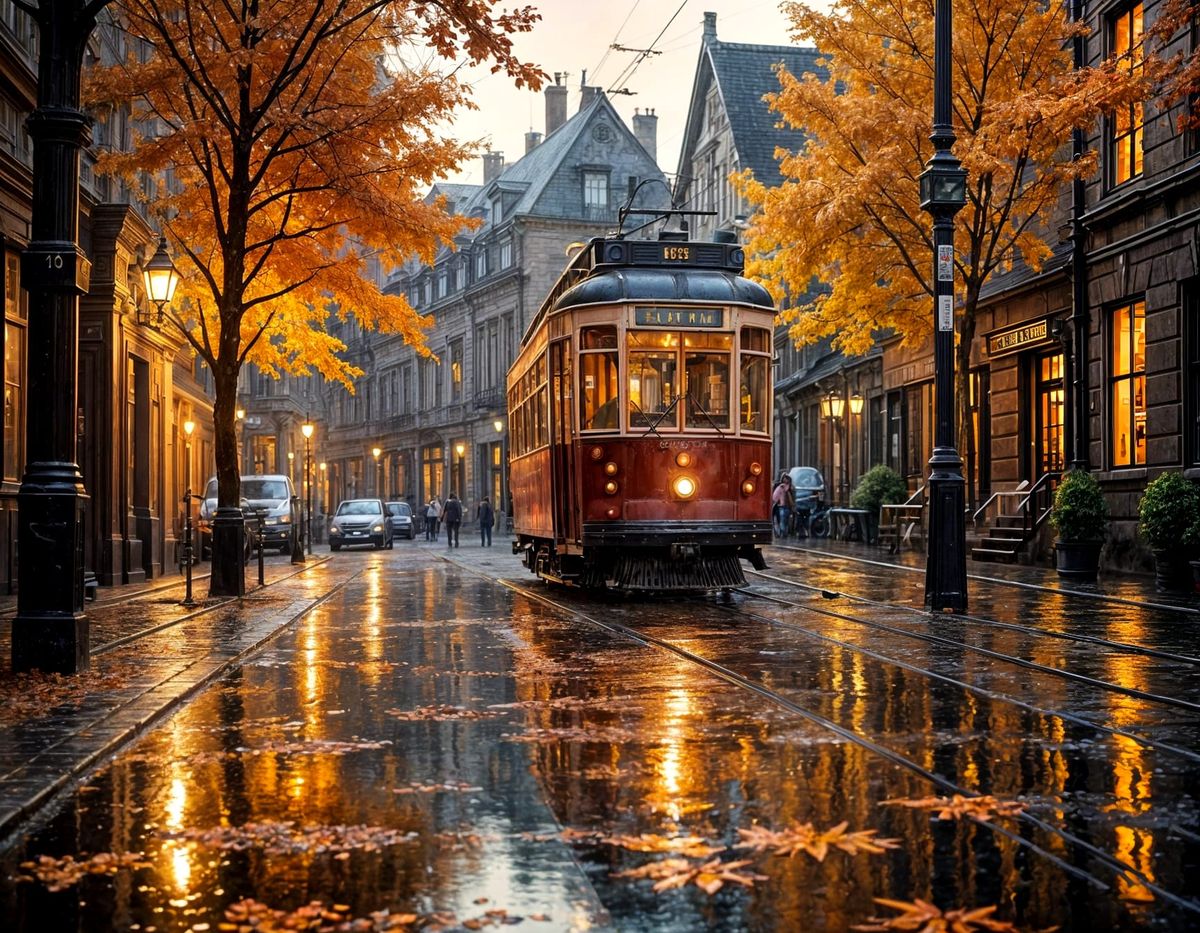 This oil painting captures an old burgundy tram on a wet, cobbled street in a European city at sunset. Autumn leaves and early snow reflect the golden and pink light, rendered with watercolor and gouache techniques.