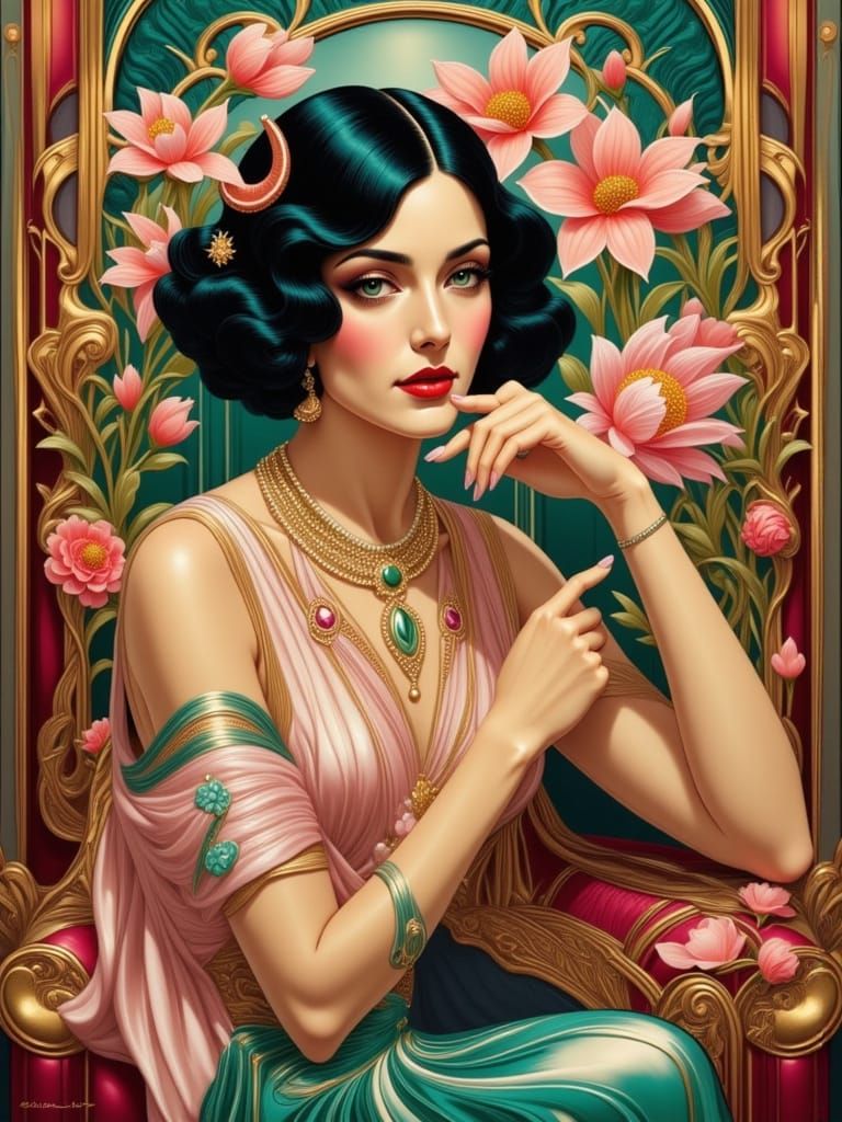 A striking image of a woman in lavish 1920s attire, set against surreal spring flowers with metallic accents. The scene blends luxurious Art Deco style with vibrant colors and intricate details.