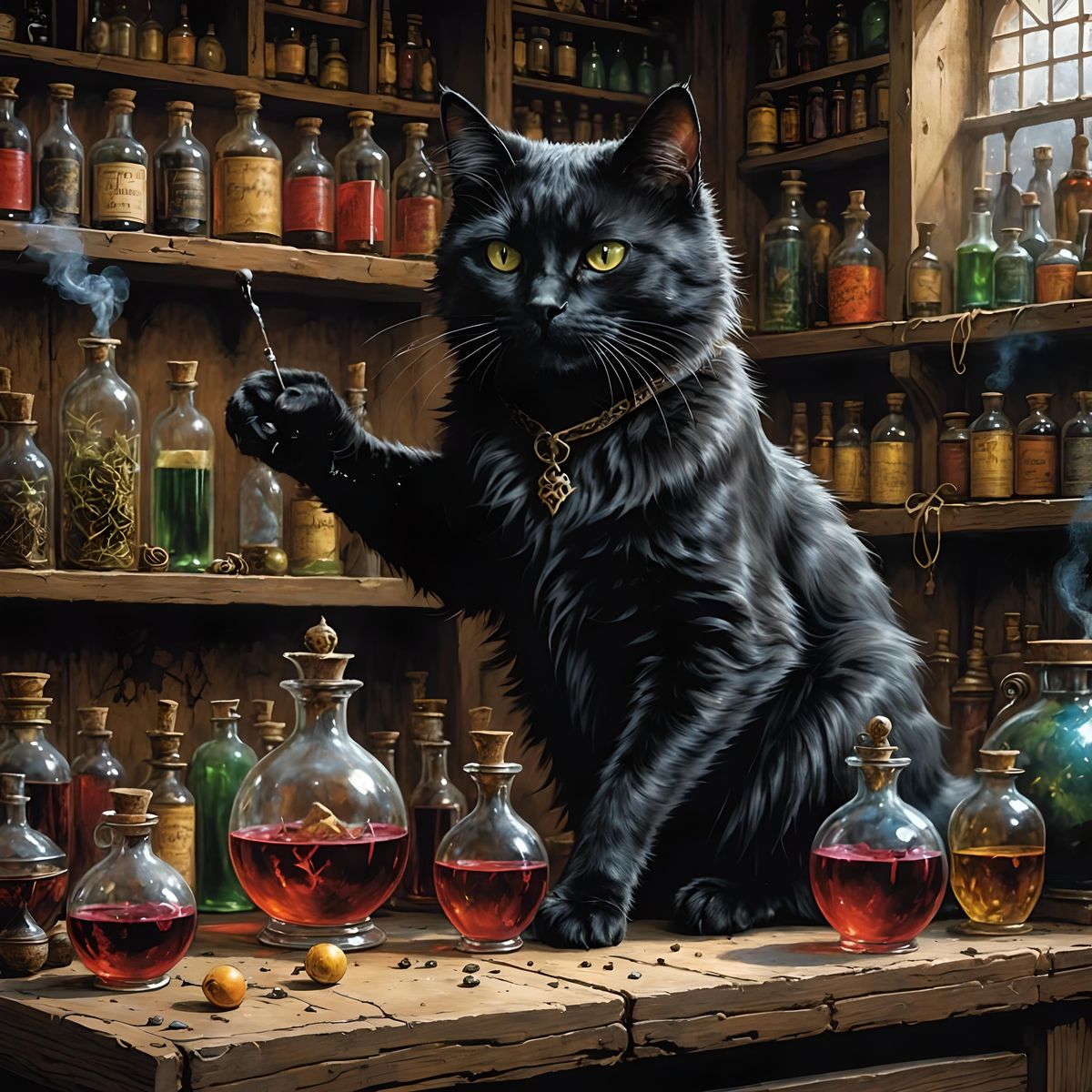 A dark fantasy illustration of a black cat causing chaos in an alchemist's laboratory. The image features a detailed background and a colorful comic book aesthetic.