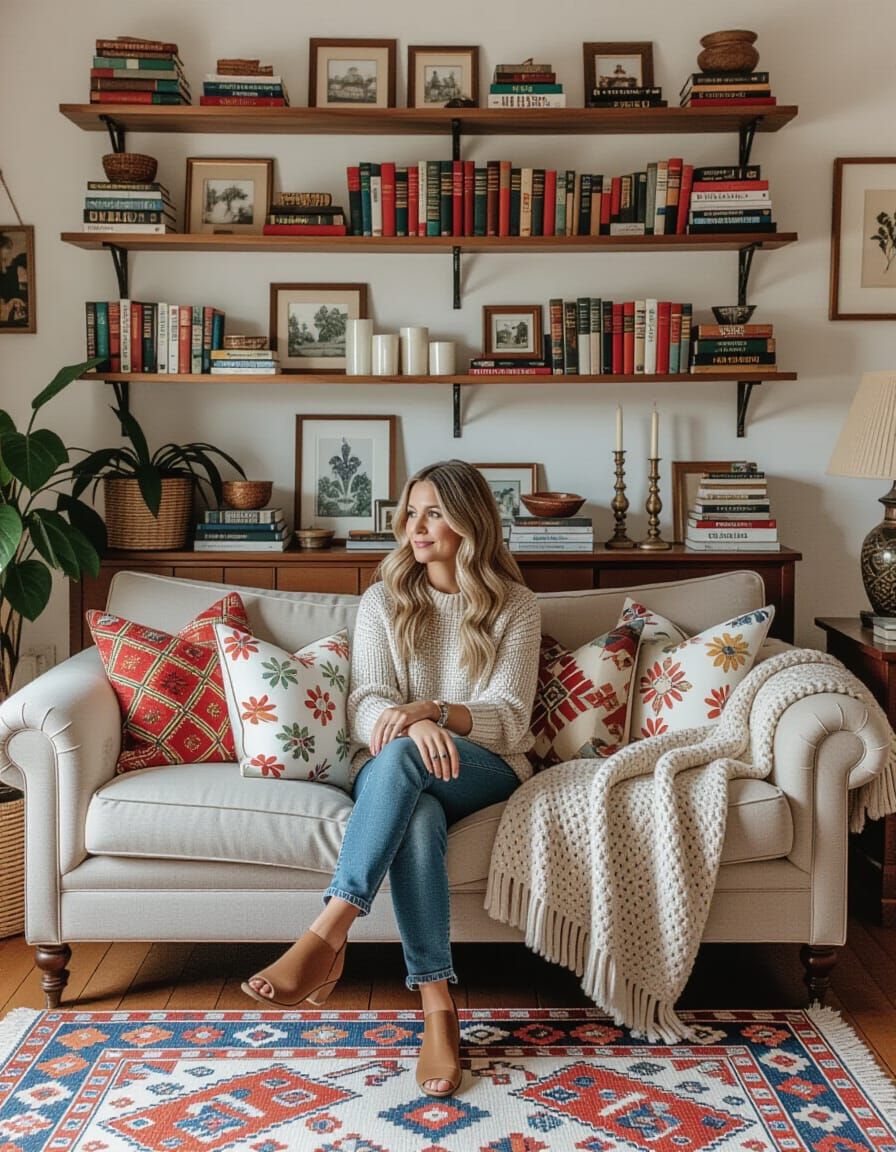 A woman relaxes in a cozy living room filled with books and plants. Natural light fills the eclectic space with layered rugs and shelves as 3D rendered digital art.