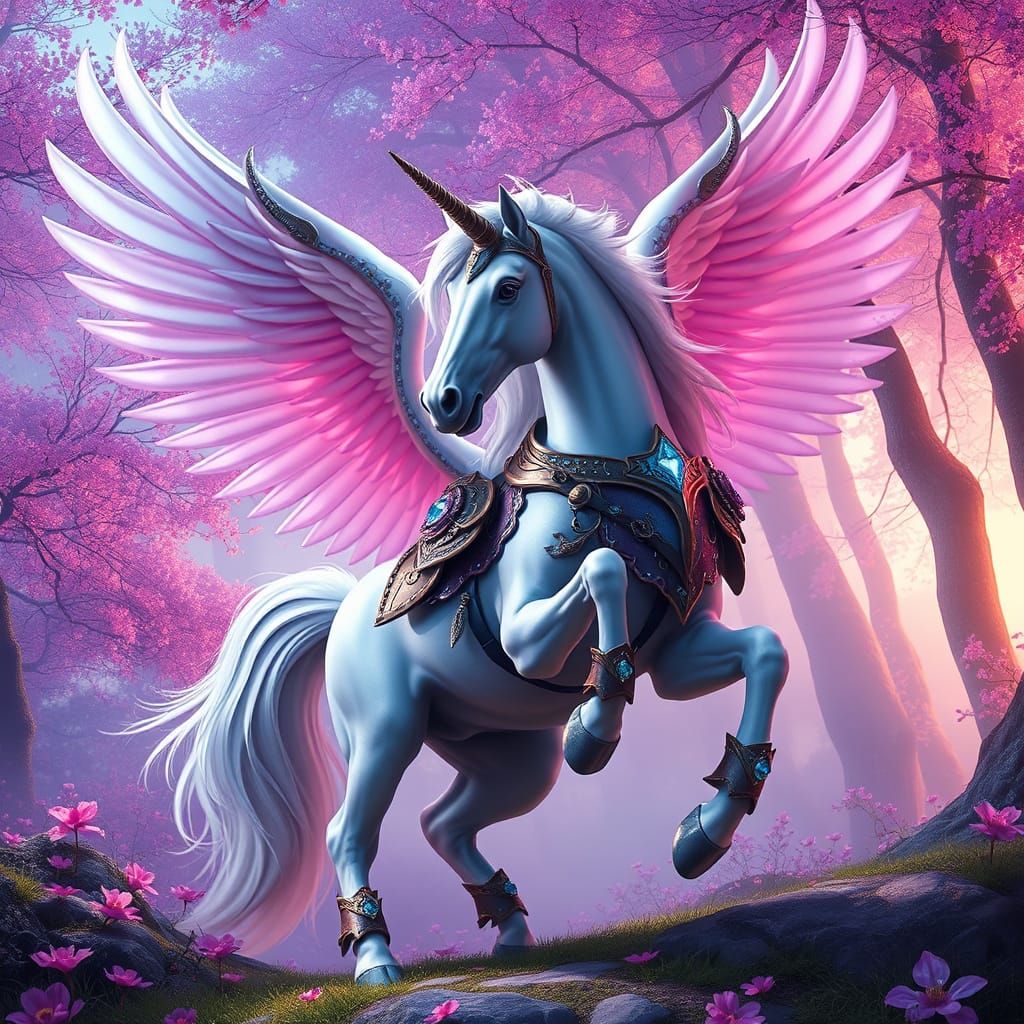 A majestic alicorn wearing gemstone-encrusted armor stands heroically in an enchanted forest filled with pink and purple hues. This matte painting style image features deep colors and intricate details.