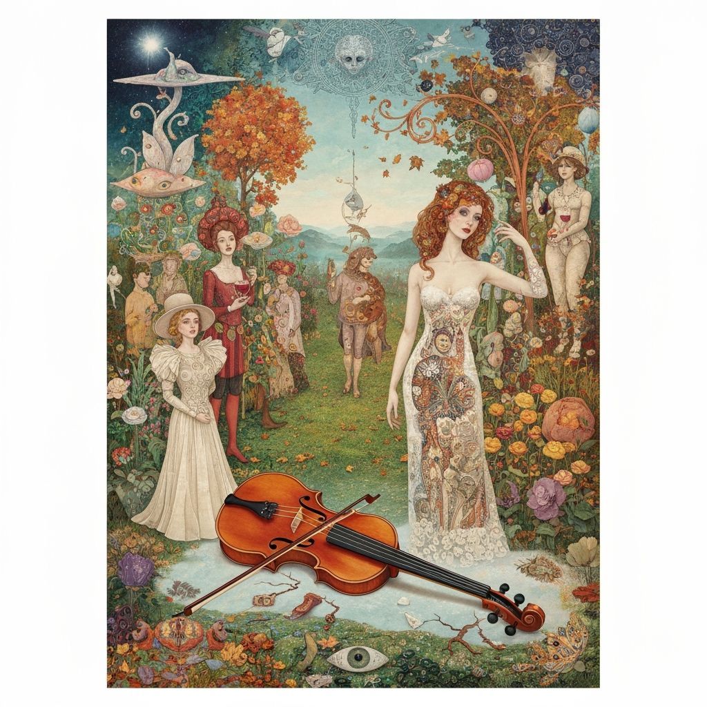 A surreal digital collage depicting a woman with a viola surrounded by bio art. The artwork blends nature scenes, abstract designs and musical elements, in a vibrant, textured style.