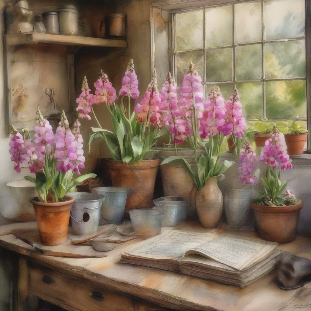 This charming, photorealistic image captures a quaint garden work station filled with vibrant flowers, antique tools, and delicate details, evoking a stylized, bohemian atmosphere reminiscent of intricate watercolor and alcohol ink artistry.