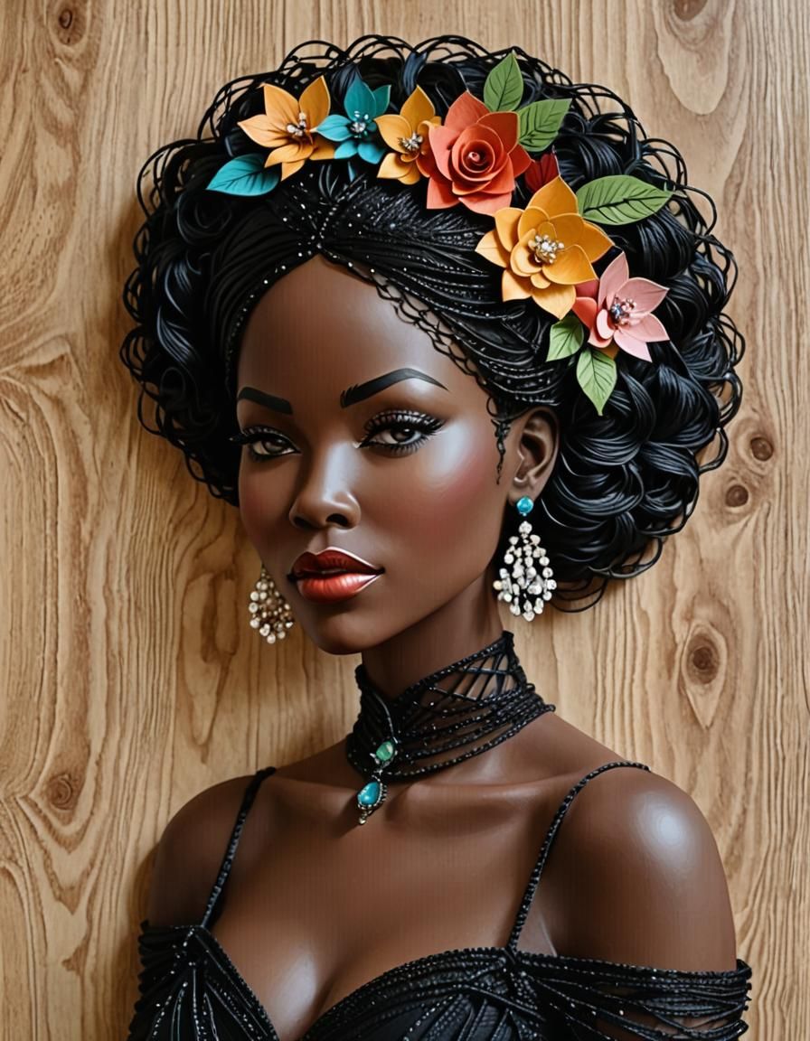 This image shows an elegant black woman depicted with string art in a fairytale style. The artwork captures the subject with a vibrant and colorful palette.