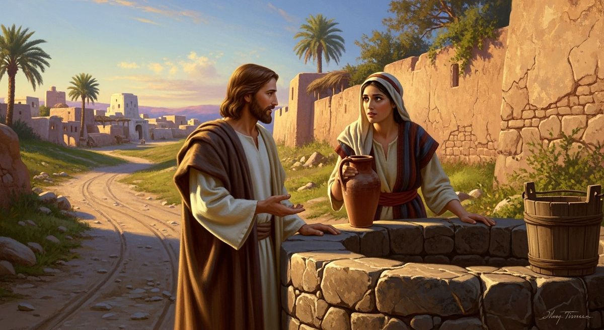 This image shows Jesus in conversation with a Samaritan woman at a well in ancient Israel. The scene, set in the late afternoon sun, is reminiscent of historical paintings with rich detail and warm lighting.