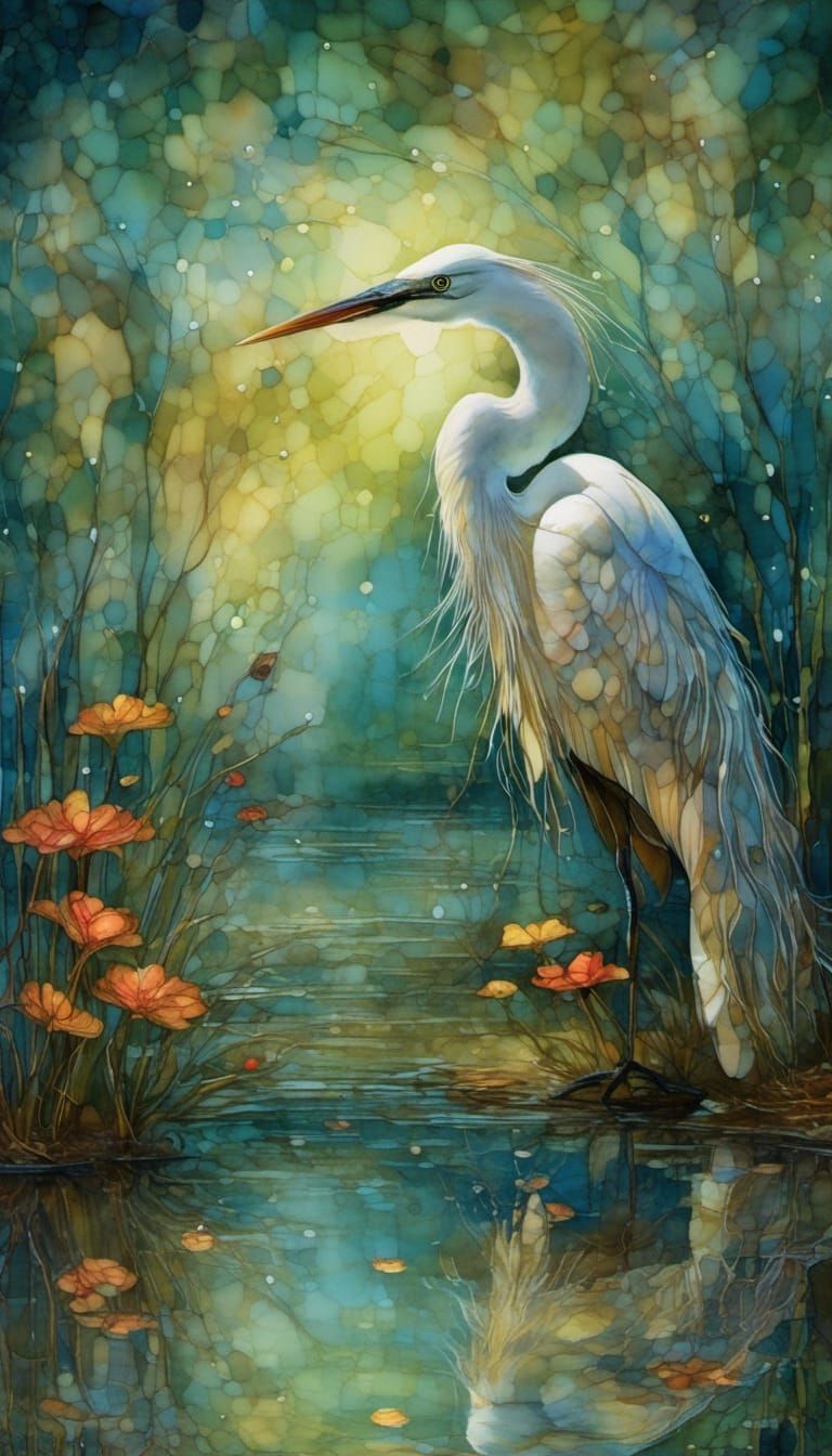 This image shows a white egret in a pond at night. The image has sharp edges and rough textures, and is reminiscent of alcohol ink art and mixed media with a 3D rendered aesthetic.