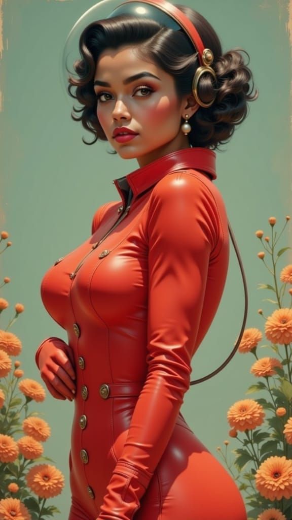 A striking image of a muscular Black woman in a vintage-inspired spacesuit. The portrait blends elements of classic pin-up art with futuristic themes, showcasing a unique fusion of styles.