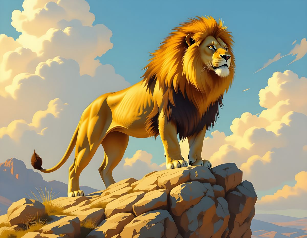 Oil painting. Medium shot. A majestic Nemean Lion stands proudly atop a rocky crag, its golden fur gleaming in the sunlight, a symbol of strength and invincibility. The scene is bathed in golden sunlight. Detailed, intricate, realistic, vibrant colors, 4k resolution, trending on Artstation, best quality, a masterpiece, paleoart.