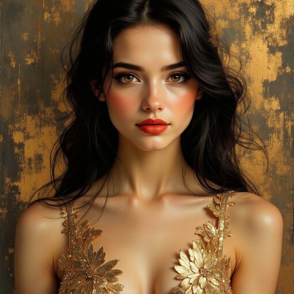A hyperrealistic close-up of a stunning raven-haired goddess in a gold gown, featuring dramatic oil painting textures and cinematic lighting reminiscent of Old Masters.