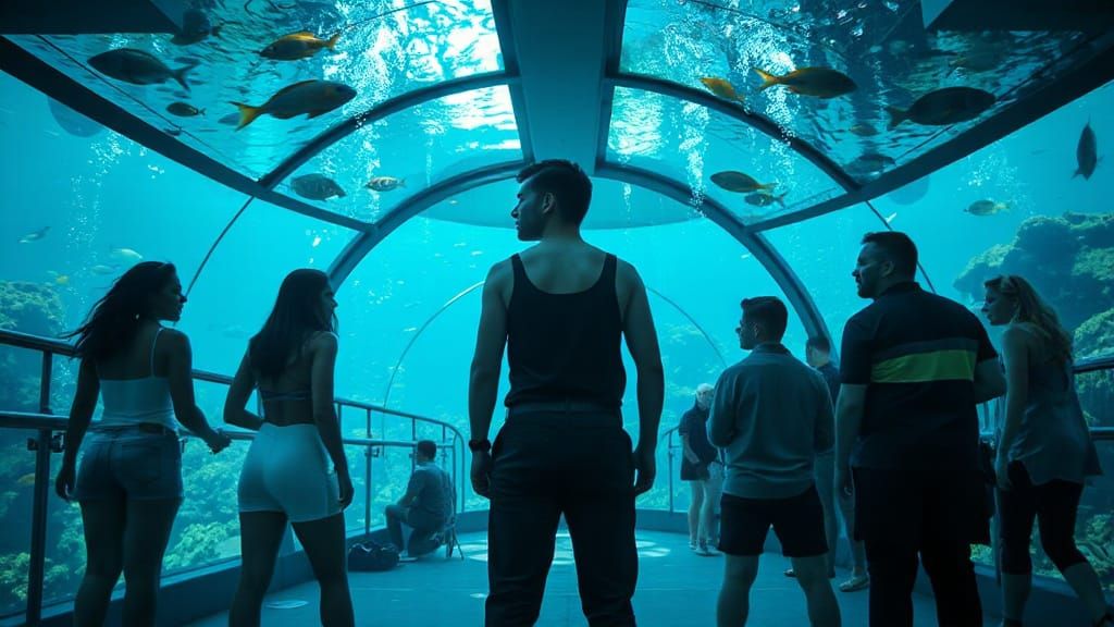 This image shows an aquaponic farmer named Aria in an underwater nightclub with friends. The scene is lit with cinematic lighting and filled with colorful fish and corals. The artwork is reminiscent of futuristic styles in 8K resolution.