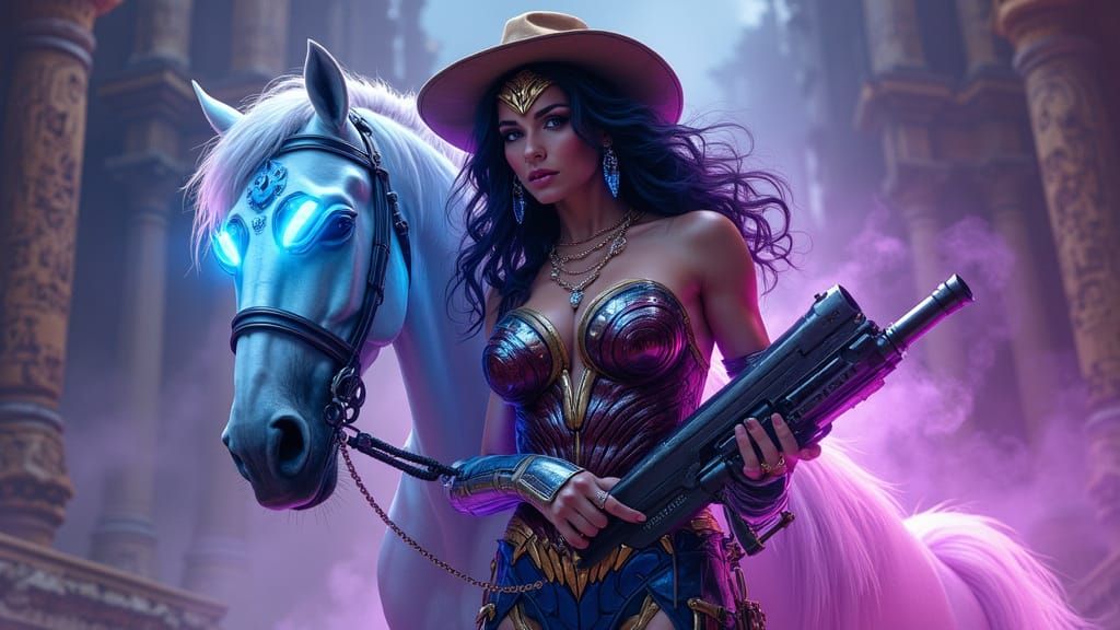 This image depicts a futuristic warrior, inspired by Wonder Woman, in a cyberpunk world. She wears high-tech armor with neon accents and holds a sleek rifle, surrounded by mystical smoke and ancient ruins in a dark, gritty city.