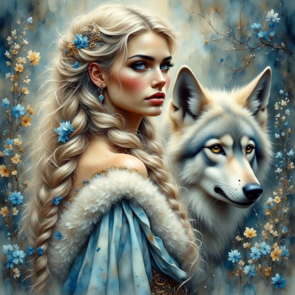 This image shows a weathered portrait of Freya, Norse goddess, with pale blonde hair, blue eyes, and a feathered cloak, accompanied by a radiant wolf. Rendered in an antique watercolor style with ink wash and oil brush strokes.