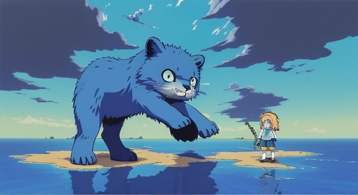 This image shows a cel-shaded anime style girl accompanied by a blue cub. The artwork features deep colors and cinematic lighting, reminiscent of Studio Ghibli and Studio Trigger.