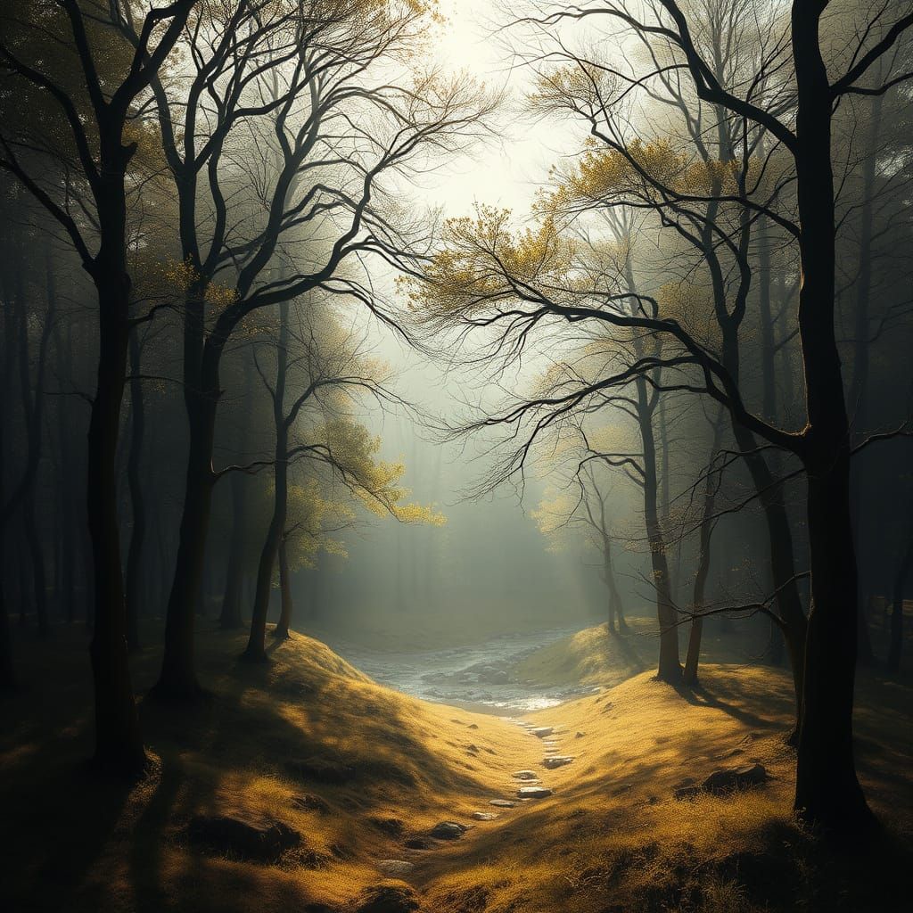 This serene landscape painting captures the soft, warm tones of nature with subtle chiaroscuro and dappled lighting, reminiscent of Romantic-era masters with intricate textures and organic forms.