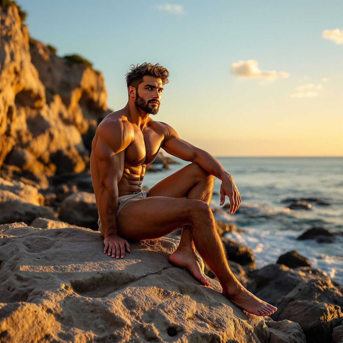A strikingly beautiful, muscular young Greek man rests on a rock by the sea at sunset. The image features warm golden light, dramatic shadows, and vibrant colors, rendered in a style evoking ethereal beauty and bold figure studies.