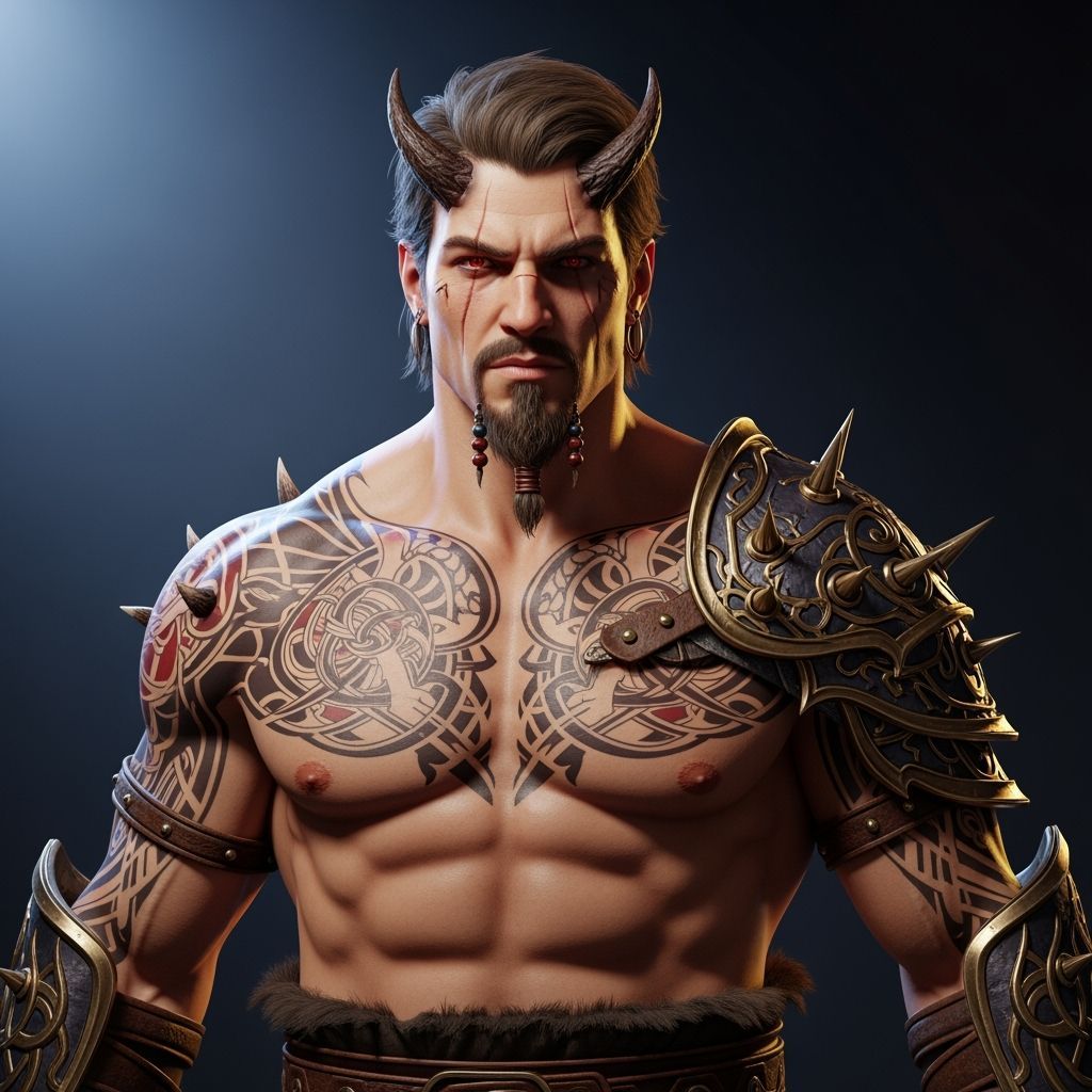 This image shows a menacing Viking warrior with a scarred face, demonic features and intricate tattoos. Hyperdetailed and dynamically lit, the portrait showcases triadic colors and volumetric lighting.