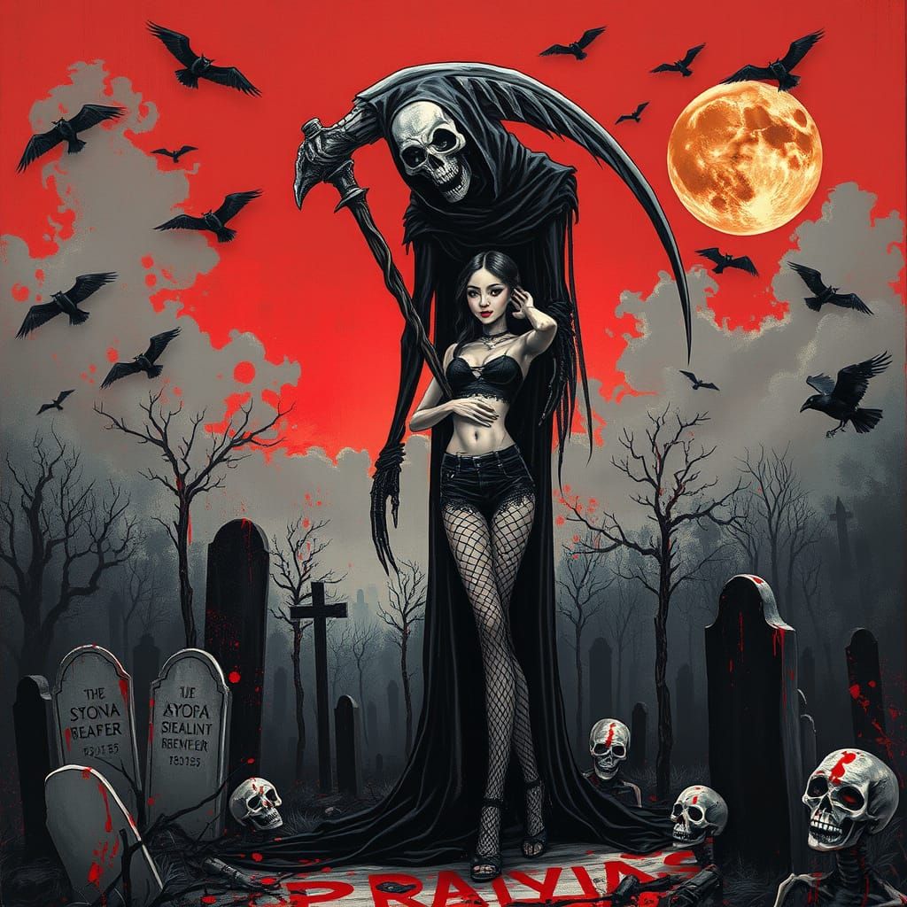 This image shows a gothic woman being held captive by a tall reaper in a dark, eerie graveyard scene. The artwork blends graffiti and splash art elements with high contrast, polychromatic colors, evoking a sense of foreboding and dread.