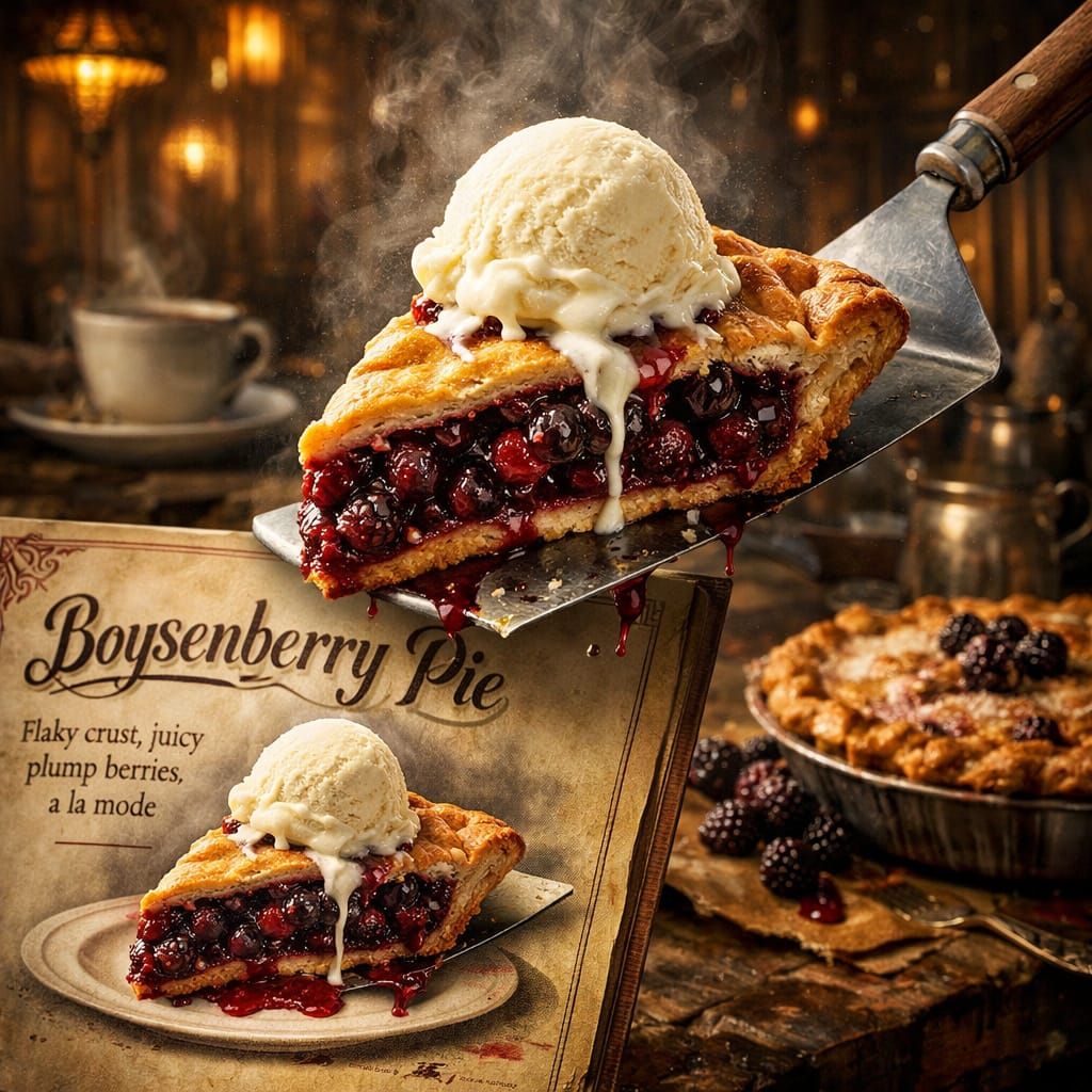 This image depicts a delicious Boisenberry pie, complete with a scoop of vanilla ice cream, transitioning from a menu item to a real dessert. Features cinematic detail and atmospheric lighting.
