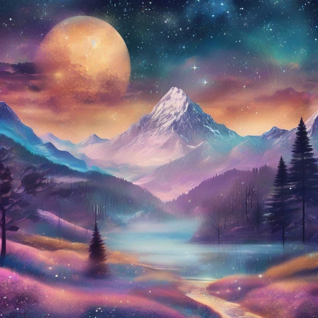 This image shows a science fiction landscape with frosty mountains. The digital art features a wide-angle view, triadic colors, sparkling glitter, shimmering mist and a vibrant color scheme with a golden glow.