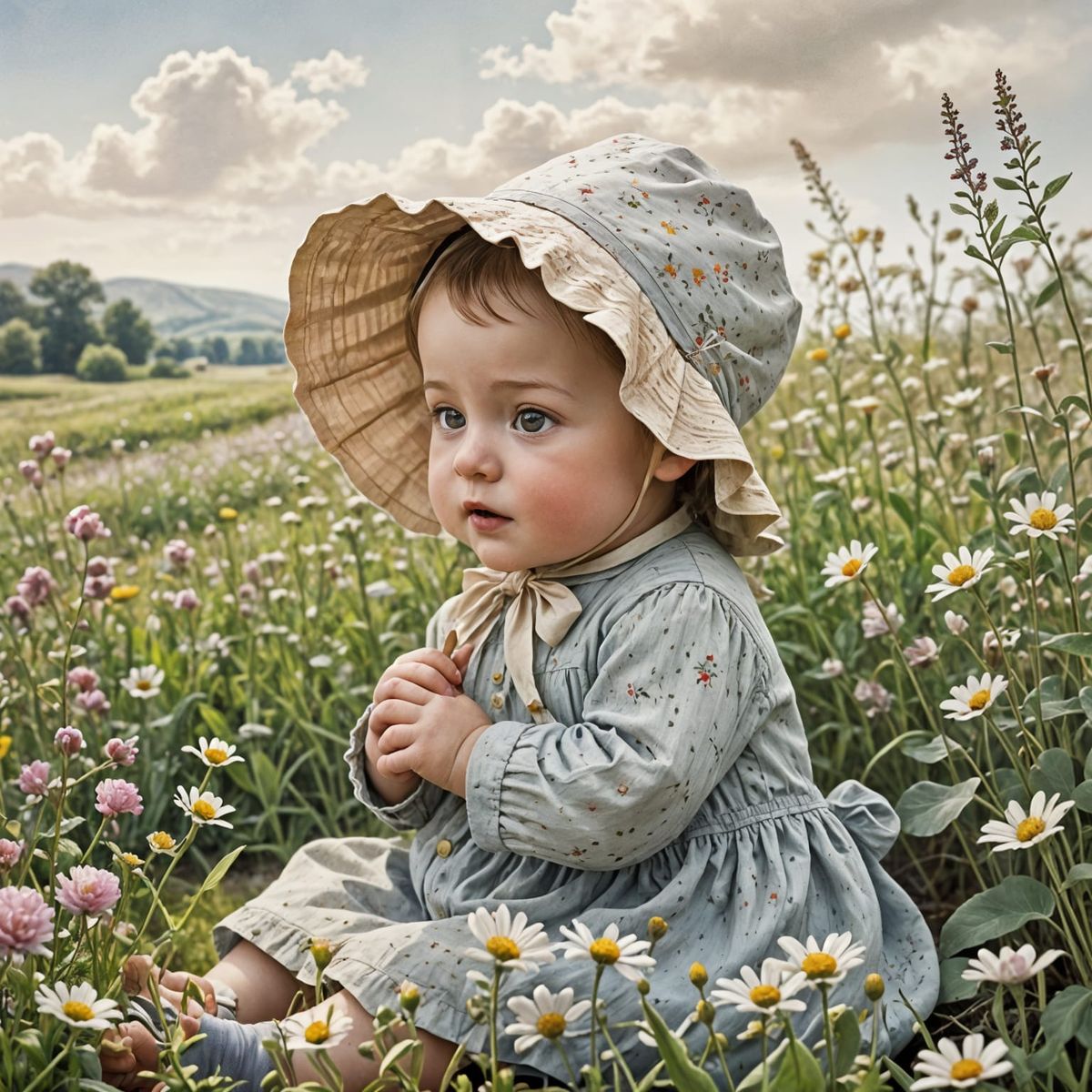 This image depicts a sweet baby girl in a bonnet resting in a vibrant flower field, rendered in a soft watercolor style reminiscent of vintage children's books.