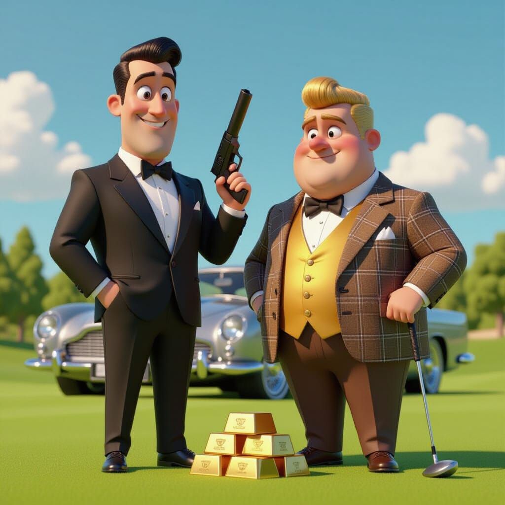 This image shows a thin man in a tuxedo with a pistol and a stout man with a golf club amidst gold bars. The scene is rendered as vibrant, Pixar-inspired 3D art.
