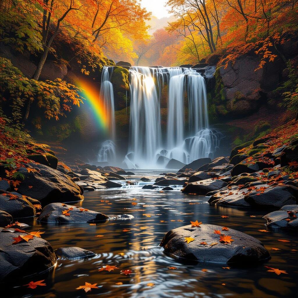 This hyperrealistic image captures a majestic waterfall flowing down a mountainside adorned with vibrant autumn leaves. Golden afternoon light illuminates the scene, creating a subtle rainbow in the misty spray. Photorealistic detail and sharp focus enhance the serene atmosphere.