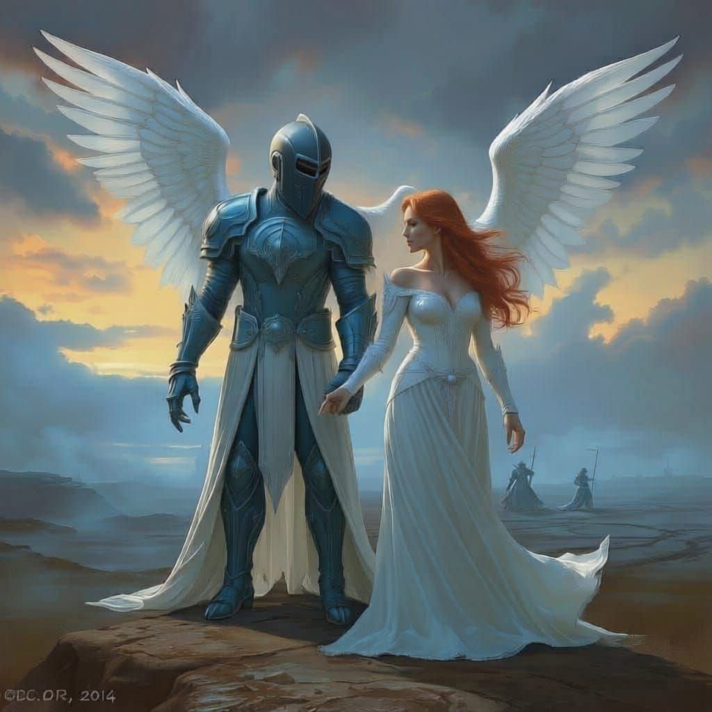 A woman in a flowing white dress is depicted holding hands with a formidable, heavily armored phantom. This haunting image captures a poignant, ethereal moment.