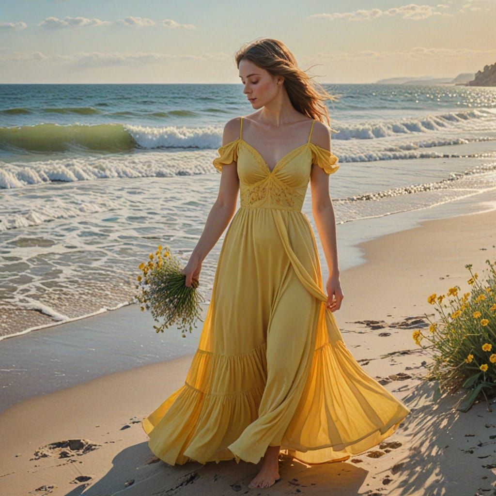 A vibrant impressionistic painting of a woman on a beach holding wildflowers. Brushstrokes of pastel colors capture the warm sunlight and shimmering waves in a dreamlike atmosphere, rendered as a cinematic masterpiece.