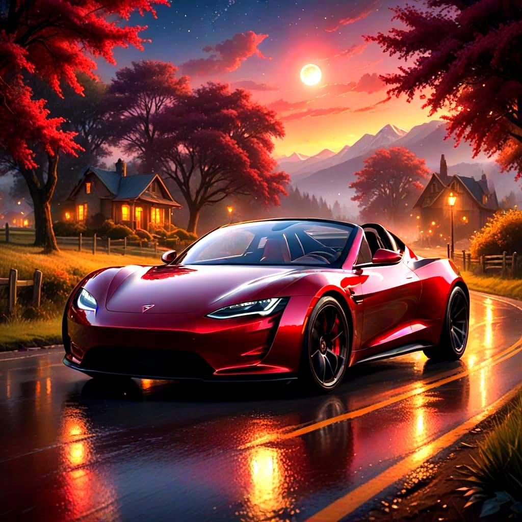 A hyperdetailed image of a cherry red Tesla Roadster on a country road under moonlight. This ethereal fantasy scene evokes the style of Thomas Kinkade's paintings.