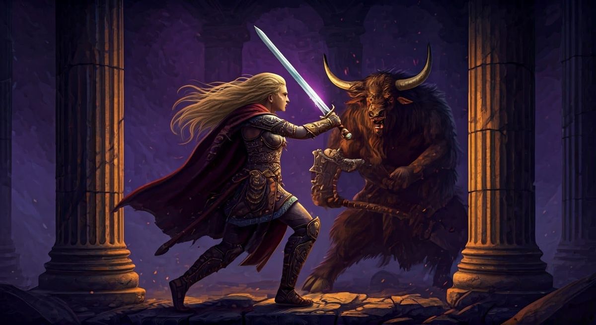 This image depicts a tall blonde woman in Viking armor standing strong against a mighty minotaur wielding a massive axe, set against a backdrop of ancient Greek columns in a dark fantasy world with rich textures and vibrant purple and yellow hues.