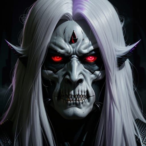 This image shows a menacing figure wielding a strange object. The figure has pale skin, white hair, and glowing red eyes, set against dark, ominous shadows with intense lighting in a photorealistic horror style.