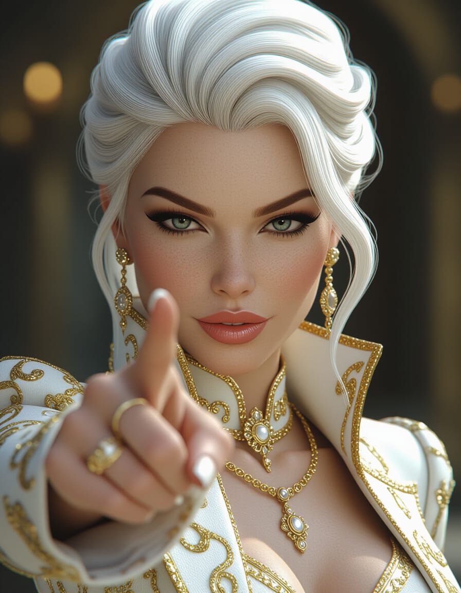 A striking picture of an albino woman with golden fashion accessories pointing directly at the viewer. The image is hyperdetailed and rendered in 16K, with an octane render.