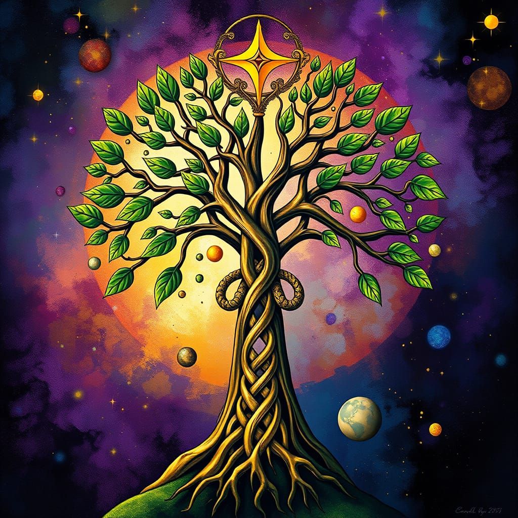 This image showcases a hyperrealistic art nouveau style depiction of a Celtic knot heart, rooted in an ash tree, surrounded by vibrant purple, green, and golden hues, evoking themes of love, soul, creativity, and inner child magic.